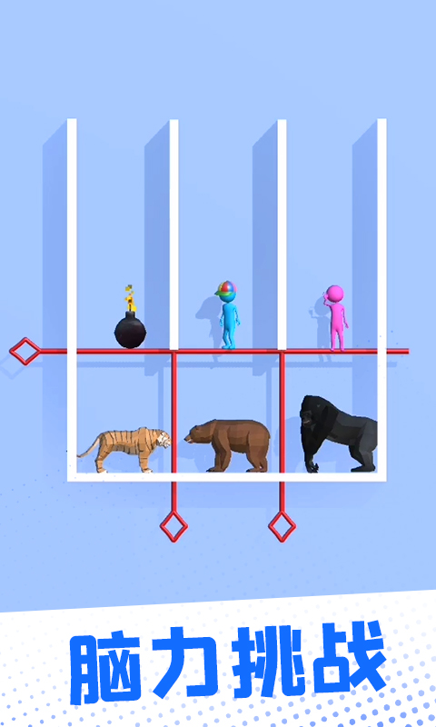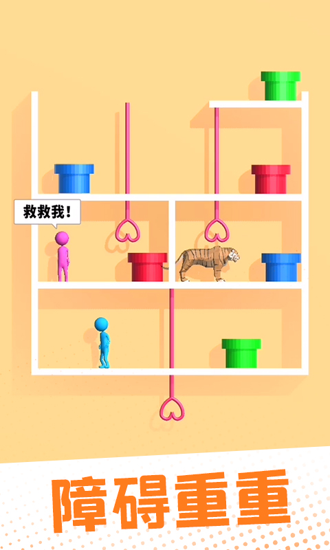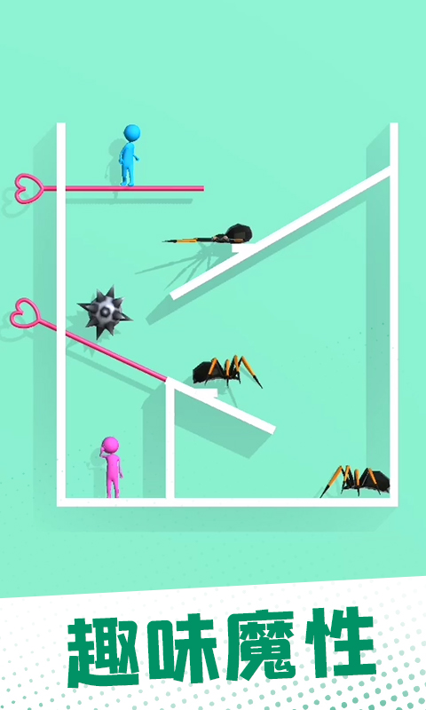 《爱的魔力别针红包版》是一款充满创意与挑战的解谜类手游,玩家需要通过拔出别针来破解机关,帮助被困在兽笼中的情侣成功团聚。游戏融合了物理元素与策略思维,随着关卡推进,难度逐渐升级,既考验玩家的逻辑分析能力,又带来紧张刺激的闯关体验。独特的红包奖励机制让每一次成功解谜都充满惊喜,清新简约的画风搭配丰富的机关设计,为玩家打造了一场兼具趣味性与成就感的脑力冒险。快来下载体验,用智慧为爱情铺平道路吧!