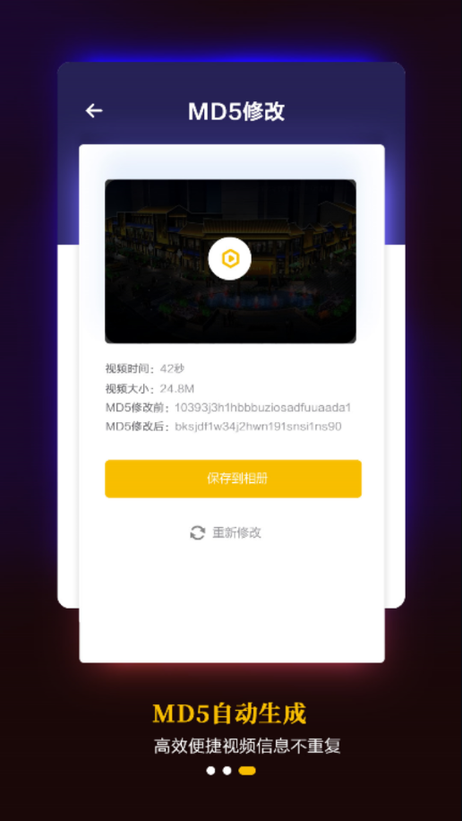 支持修改视频MD5,视频不重复,上热门更便捷;通过改变视频的数字指纹,有效避免平台查重机制,提高视频曝光率。操作过程安全可靠,不会影响视频的原始质量和内容,是短视频创作者必备的实用功能。