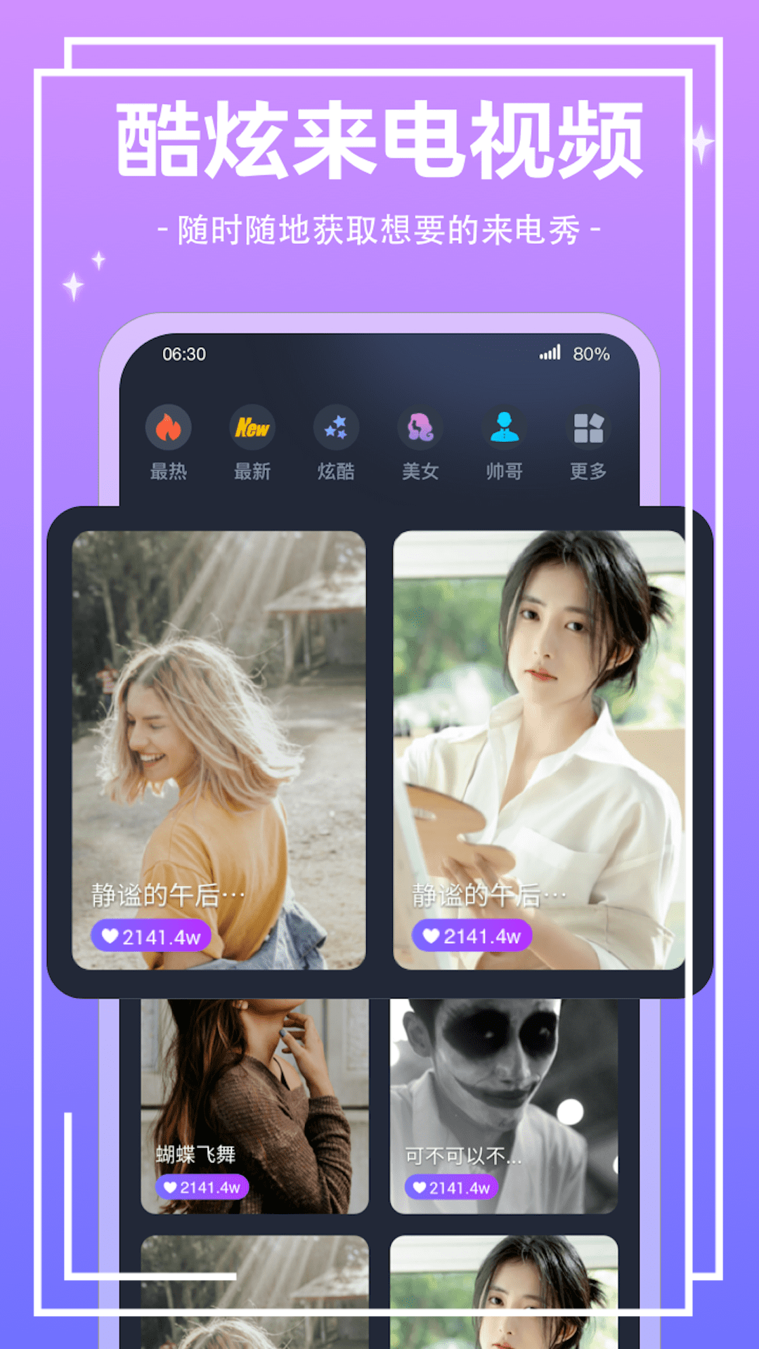 【酷炫】软件内置专业设计师打造的高清视频素材,让您的来电视频动感十足、酷炫非凡。支持自定义上传功能,可以将喜欢的视频设为来电秀。