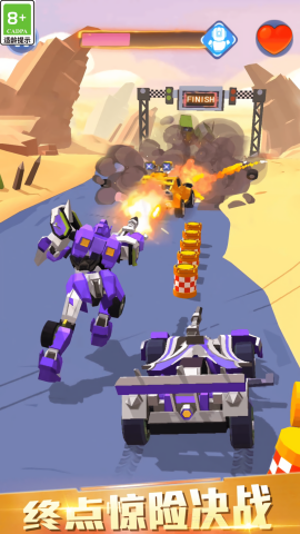 变形战斗系统:赛车和机甲形态可以自由切换,每种形态都有专属技能,遇到障碍时变身机甲能直接摧毁,打boss特别爽快。游戏还加入了连击系统,连续变形攻击可以触发更强大的组合技。多样赛道设计:从城市街道到火山地带共有八种不同风格的赛道,每个赛道都有独特的机关和挑战,玩起来充满新鲜感。赛道还会随游戏进度动态变化,增加更多不确定性。升级成长体系:通过比赛获得的金币能强化机甲装备,提升速度或攻击力,看着自己的机甲越来越强特别有成就感。升级系统包含上百种配件组合,让玩家打造独一无二的战斗机器。