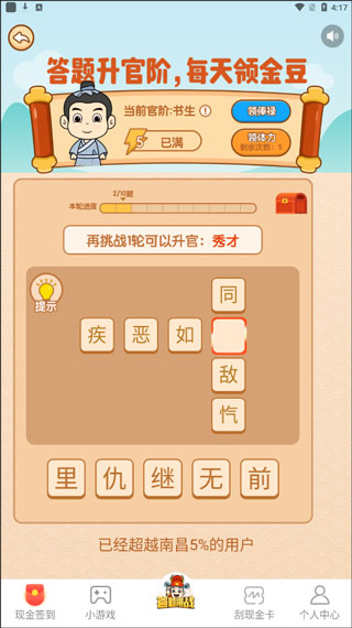 《成语升官记》最大的特色在于其创新的学习方式。它将枯燥的成语记忆转化为有趣的游戏体验,通过任务挑战、官职晋升等游戏机制,让学习过程充满成就感。软件巧妙地将传统文化元素与现代科技手段相结合,既保留了成语的文化内涵,又赋予了它们新的表现形式。无论是想要系统学习成语的学生,还是希望提升文化素养的成年人,都能从中获益匪浅。