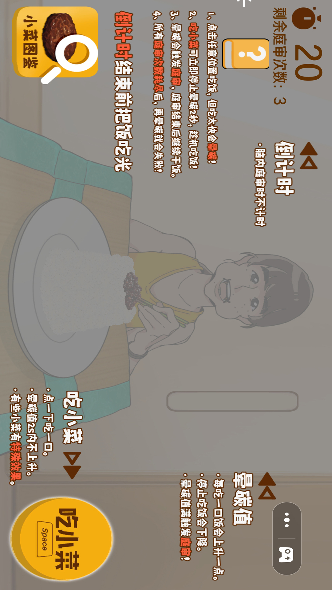 《米饭仙人晕碳时刻》是一款充满趣味与挑战的休闲游戏,玩家将扮演一位因过度摄入碳水化合物而陷入“晕碳”状态的米饭仙人,展开一场胃与脑的激烈对决。游戏以轻松幽默的画风呈现,玩家需要通过快速反应和策略选择来平衡食欲与理智,避免因暴饮暴食而陷入“晕碳”状态。丰富的关卡设计和独特的玩法机制,让玩家在享受游戏乐趣的同时,也能感受到健康饮食的重要性。