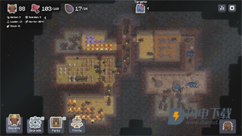 首次进入游戏会有新手教程,跟随提示可以完成各种初期任务,帮助玩家快速掌握游戏的基本操作和核心机制。完成新手教程后,进入主界面,点击右下角的"start game"开始游戏,开启您的蚁群管理之旅。点击"start"后选择地图,地图确定后即可开始指挥蚁群,每张地图都有其独特的资源分布和挑战。游戏正式开始时,左上角会显示蚂蚁数量和食物,点击右下角的树桩进入蚁穴管理界面,这里可以查看蚁群的详细状态。在蚁穴界面,点击左下角的"buy ants"可以花费资源购买不同类型的蚂蚁,它们的成本各不相同,需要根据当前需求合理分配资源。进入蚁穴后选择"build"来扩建,可以建造蚁后、食物区域、矿石区和堡垒等,完善的设施是蚁群发展的基础。通过孵化更多的蚂蚁和修建新的建筑来征服周边区域,最终建立强大的蚁群,成为地下世界的霸主。
