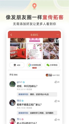 支持发布朋友圈来宣传店铺的营销活动,上传照片来详细描述;丰富的图文编辑功能让展示更生动。用户可以分享其他人的动态到微信朋友圈、空间等,获得相应的现金红包;社交裂变传播效果显著。支持在线留言评论,和商家或用户进行讨论交流;构建良好的互动社区氛围。可以查看附近好店,查看并领取到店实惠名额去线下门店消费;线上线下无缝衔接。可以发布生活动态,探索和发现同城有趣的陌生人;拓展社交圈子的最佳途径。关注喜欢的用户,随时接收和查看对方发布的动态;个性化订阅满足不同兴趣需求。