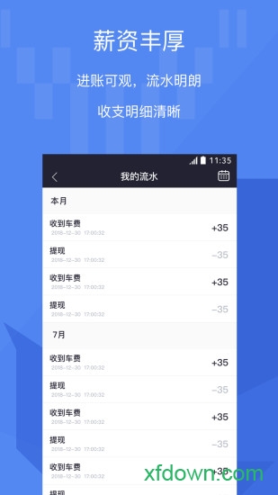 快速进账,流水明朗。收支明细清晰。司机可随时查看每日收入明细,提现便捷,资金到账快,让收入更有保障。