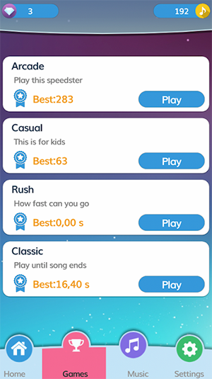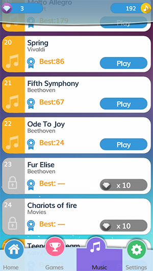 按黑色方块出现在屏幕上的顺序点击它们。现在您可以选择要播放的歌曲,每次播放歌曲时都可以赚取音符。这些音符不仅可以用来解锁新的歌曲,还可以用来购买游戏内的各种道具和装饰。游戏的操作简单直观,但要想在高级难度下取得高分,则需要玩家具备极高的反应速度和节奏感。