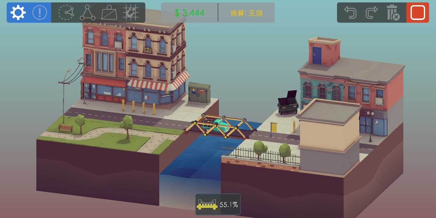 游戏采用独特的2D/3D切换视角设计。在计划阶段,玩家可以在简洁明了的2D界面中规划桥梁结构,选择最优的建筑方案。这个阶段需要充分考虑材料的强度、成本和使用效率。每个关卡都像是一个精心设计的物理谜题,需要玩家运用创造性思维来破解。游戏鼓励大胆尝试,玩家可以充分发挥想象力,建造出既美观又实用的独特桥梁。