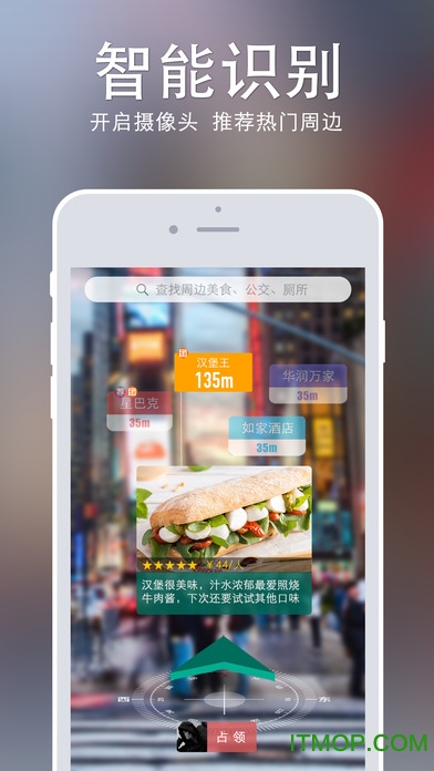 【实景感知周边】智能定位,举起手机扫描四周,周边美食,电影,景点,公交,酒店,KTV实景展现,应有尽有,方便快捷,有趣而直观。系统会根据用户偏好智能推荐,并显示商家评分和人均消费等实用信息。