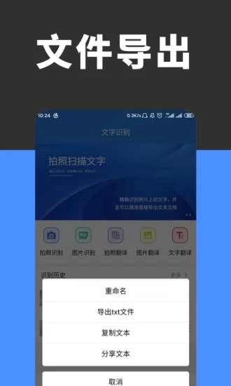 图片转文本神器:采用先进的OCR识别技术,能够将手机拍摄的纸质文档中的文字快速识别并导出为可编辑、复制、保存或分享的文本内容。支持多种语言的识别和翻译,是您学习外语、处理外文资料的得力助手。