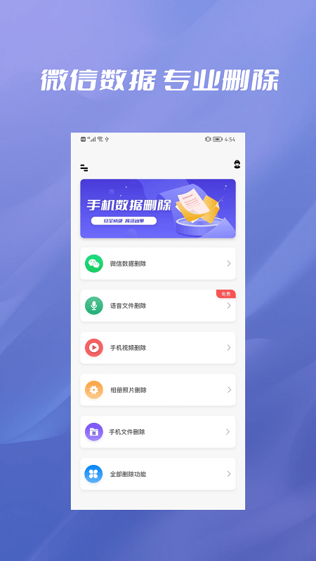 手机数据彻底删除app是一款专为手机用户设计的数据清理软件,以其简洁直观的界面和强大的功能深受用户喜爱。该软件能够帮助用户快速删除手机中的各类数据,包括图片、文件、视频等,有效释放存储空间,提升手机运行速度。无论是日常清理还是彻底删除敏感数据,这款软件都能轻松应对,确保数据无法恢复,保护用户隐私。此外,软件操作简单,适合各类用户使用。如果您正在寻找一款高效、安全的数据清理工具,不妨下载体验这款软件,它将为您的手机带来全新的使用体验。