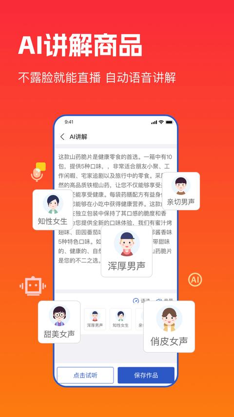 主播宝app最令人称道的亮点在于其丰富的素材库和智能辅助功能。软件内置海量专业文案模板,涵盖各类商品品类,主播可根据需要随时调用;其创新的虚拟直播间功能支持背景自由切换,让每场直播都能呈现最佳视觉效果;此外,智能AI商品讲解功能可以自动生成专业的产品介绍,为主播提供强有力的内容支持。