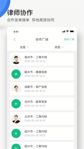 律师协作:创新性地搭建了律师协作平台,通过在线发单、接单机制,帮助律师解决异地办案、案件协作等实际问题。无论是案件调查、证据收集,还是跨地区代理,都能在平台上找到可靠的合作伙伴,实现资源的高效对接。