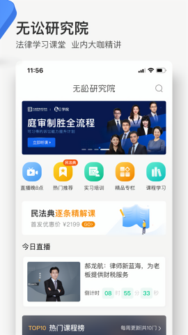 无讼研究院:平台特邀法律界权威专家和资深律师组成专业师资团队,为法律从业者打造系统化的学习体系。通过直播课程、视频教学、线下讲座等多种形式,覆盖民法实务、刑事辩护、商事经济、行业动态等核心领域。特别值得一提的是,平台每晚8点都会推出"律界大咖面对面"直播课程,用户可以实时与知名律师互动交流,直播结束后还能随时回看课程内容,确保不错过任何学习机会。
