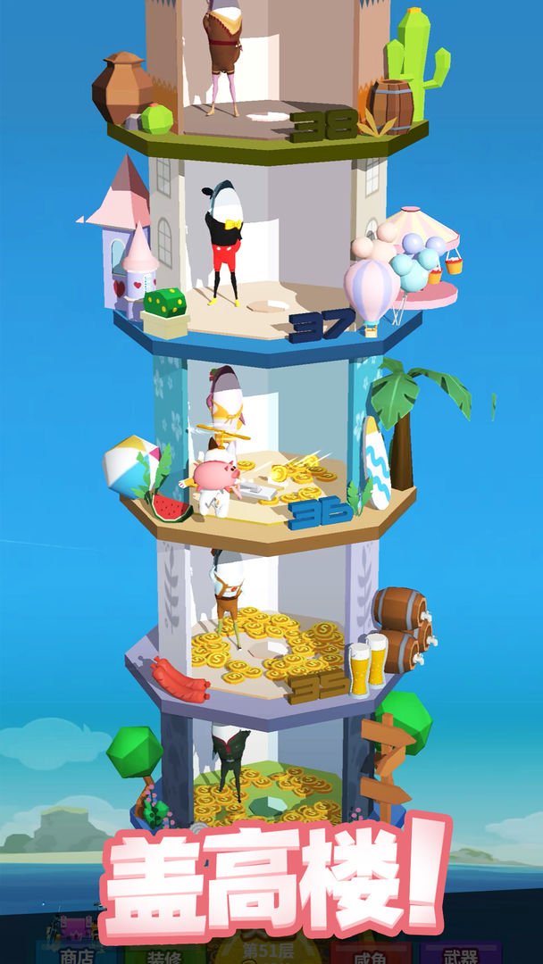 游戏的核心玩法是帮助咸鱼夫妻收集资源、建造塔楼,一步步向天空进发。在建造过程中获得的资源可以用来合成各种强力武器,以抵御不断来袭的敌人。游戏提供了丰富的道具系统,合理搭配使用可以让战斗变得更加轻松。随着游戏进程的推进,你可以解锁更多有趣的内容和玩法,包括特殊事件、隐藏关卡等。游戏还设有社交元素,可以和好友互相帮助,共同进步。