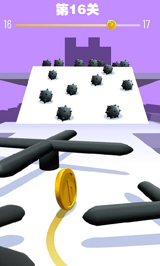 游戏拥有数十个精心设计的特色关卡,每张地图都暗藏独特机关与地形变化。从倾斜的螺旋赛道到会突然坍塌的悬空平台,玩家需要不断适应新的挑战环境。在跑酷过程中,既要躲避致命的尖刺阵列和会突然闭合的旋转门,还要尽可能收集散落的金币。最令人称道的是终点设计——必须精确控制金币的滚动速度和角度,才能使其完美落入不断移动的目标插槽,这种"一球入洞"的成就感正是游戏的精髓所在。
