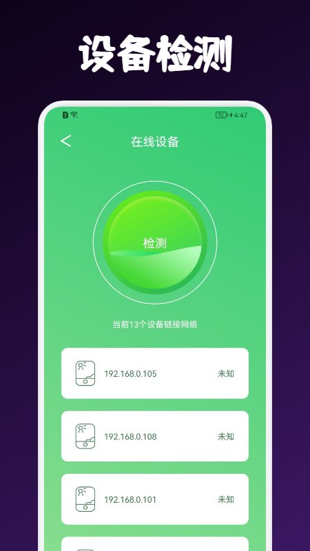 一键检测蹭网设备,无后顾之忧。该功能可以帮助用户识别是否有其他设备未经允许连接到自己的WiFi网络,确保网络安全,避免带宽被占用。