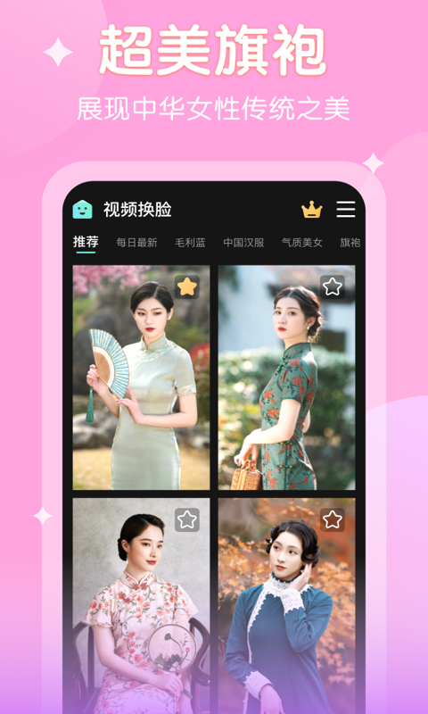 通过上传照片,您可以一键换装,体验旗袍佳人、港风复古、56个民族服饰等多种风格。无论您是想成为古典美人还是现代潮流达人,爱脸秀app都能满足您的需求。软件还支持将您的形象融入热门视频场景,让您轻松成为视频中的主角,享受沉浸式的换装体验。