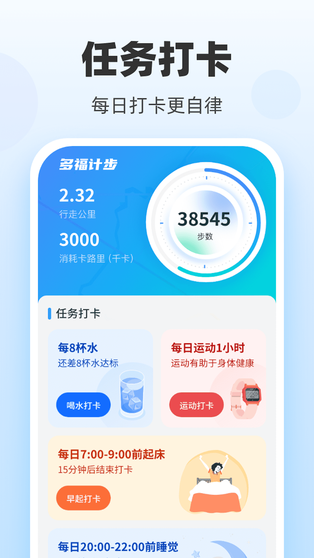 多福计步app不仅提供专业的健身计划和运动数据分析功能,还能根据用户的具体情况给出个性化的运动建议。系统内置的智能提醒功能会适时提示用户休息、补充水分,帮助养成健康的运动习惯。丰富的辅助功能让运动计划更易执行,帮助用户循序渐进地达成健身目标。
