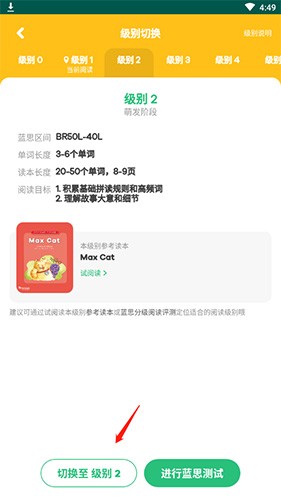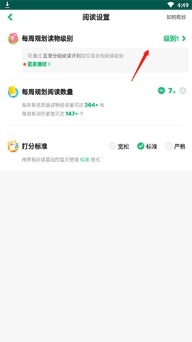 进入家长中心后,点击“阅读设置”选项,即可进入阅读级别调整界面。在“每周规划读物级别”选项中,家长可以根据孩子的学习进度选择合适的阅读级别,系统会自动保存设置。此外,软件还会根据孩子的阅读表现提供升级建议,帮助家长更好地规划孩子的学习路径。