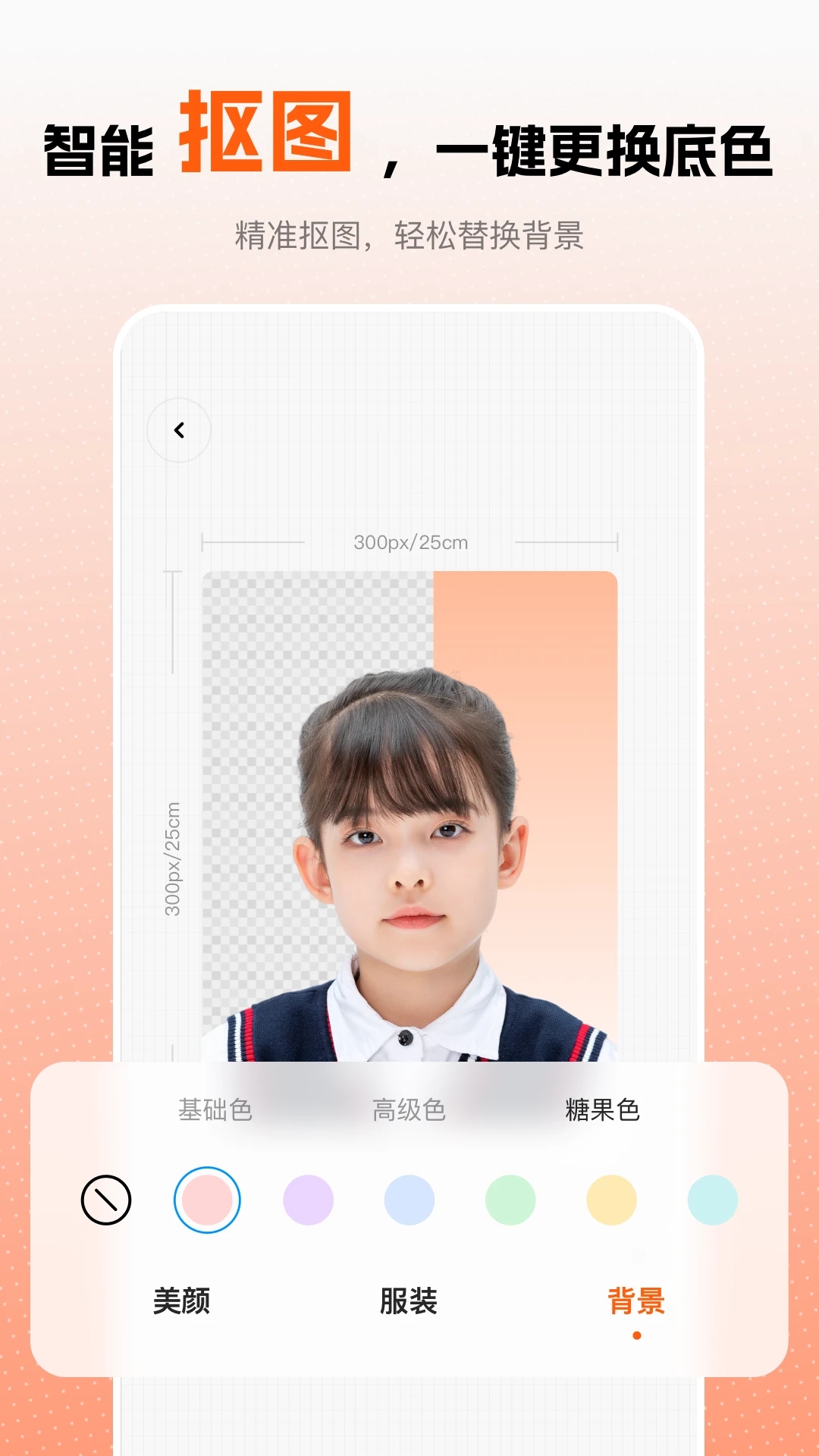 【,更换底色】发丝级抠图引擎会根据所上传图片自动裁剪,确保人像的正确位置及比例。除标准基础底色红白蓝以外,还增加渐变和糖果色。可根据不同的背景颜色要求随意切换调色,同时支持相片编辑、像素调整、照片变清晰、画质修复等功能,让您的电子照合格又好看。