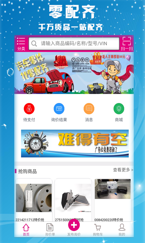 零配齐app是国内领先的汽车零配件网上商城,专注于为客户提供报价、销售、售后等一站式服务。平台汇聚了海量优质零配件,涵盖各大主流汽车品牌及车型,确保用户能够轻松找到所需配件。此外,零配齐app还提供免费查询零件和车架号服务,帮助用户精准匹配配件,避免购买错误。我们的宗旨是为客户提供最优质的服务,让您足不出户即可购齐千万好货,享受省心、省力、省钱的购物体验。