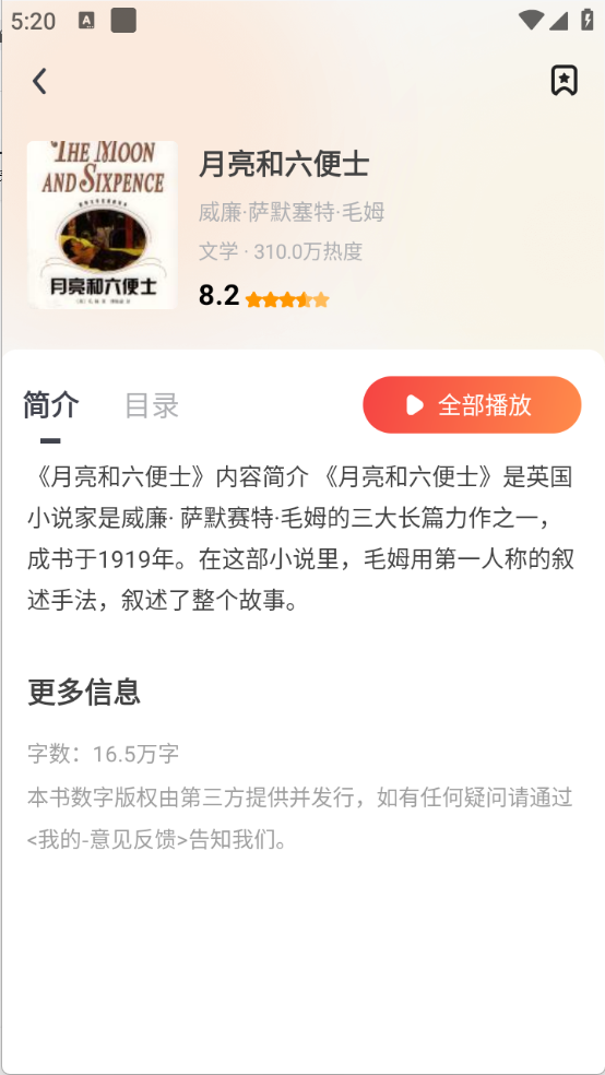 点开想要听的小说进入详情页,点击“播放”。详情页中还会显示作品的简介、作者信息以及用户评价,帮助用户更好地了解作品内容。