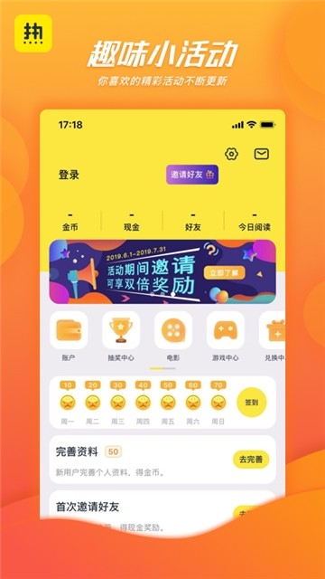 赚钱方法多,阅读资讯边看新闻边赚钱,资讯、视频、电影随时看,任务中心做不停,看大电影还可赚取高额奖励,让你不在无聊。平台每日更新大量任务,完成任务即可获得丰厚奖励。