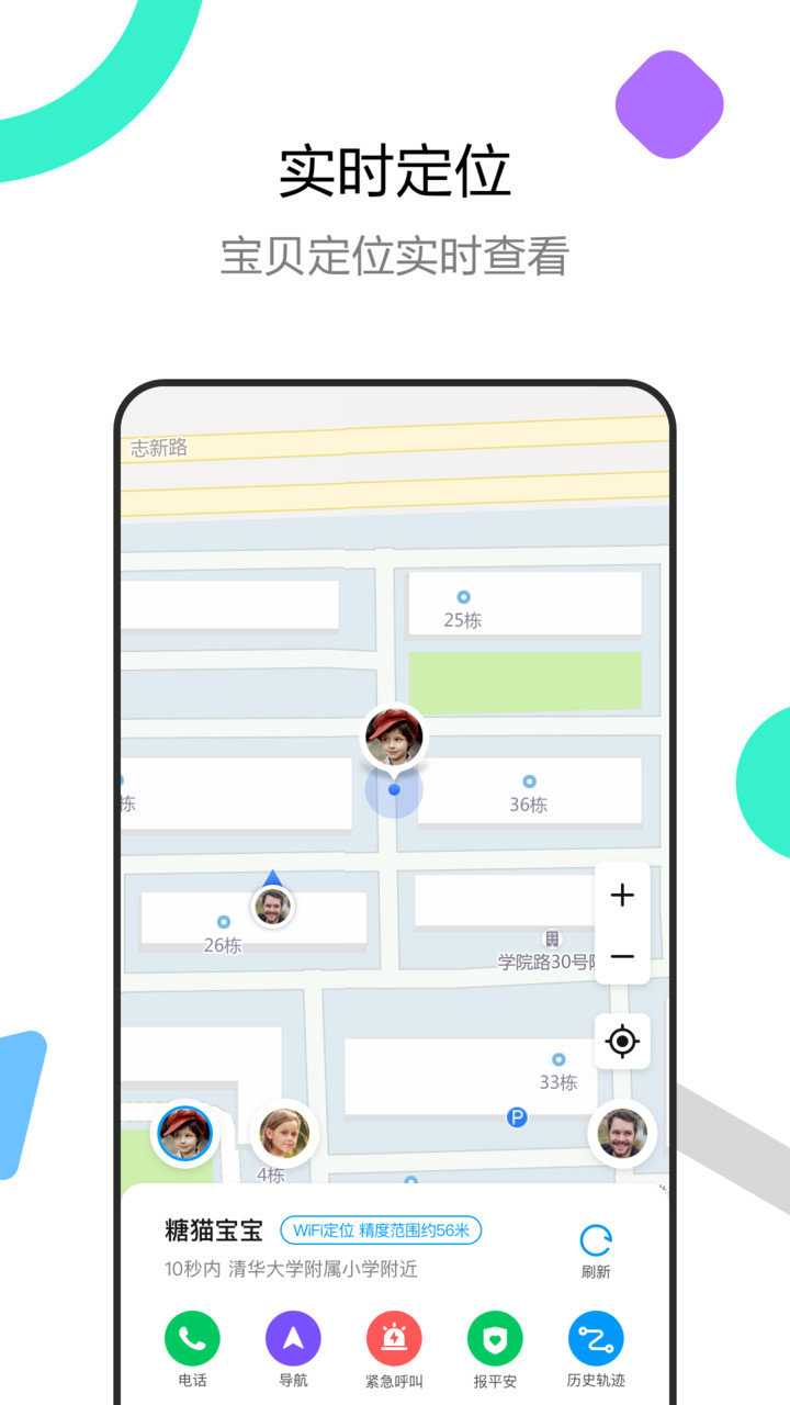 无论室内室外都能准确的知道孩子去向。采用GPS+基站+WiFi多重定位技术,定位精度可达10米以内,让家长随时掌握孩子的安全状况。