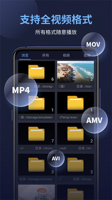 万能电影播放器可以播放mp4、avi等大多数常用或不常用格式的视频和音频,还支持手机小窗口播放,边玩手机边看视频的功能。自动扫描手机本地文件,根据自己的喜好将视频音频收藏分类,还可以建立播放列表,选择播放顺序和方式,顺序播放或者单曲循环都可以哦。调控屏幕播放比例,你就可以一边玩手机一边看视频啦!