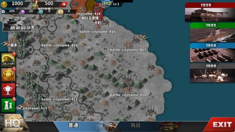 -历经二战1939、二战1943、冷战1950、现代战争1980等多个历史时期。玩家可以选择全世界任意一个国家,调整外交策略,对盟国实施援助,向其他国家宣战。根据战场形势调整战略目标,建设城市,发展科技,制造军事单位。用最少的时间夺取最多的领土将获得高分,分数会在GameCenter上和其他玩家进行排名,展现你的战略才能。