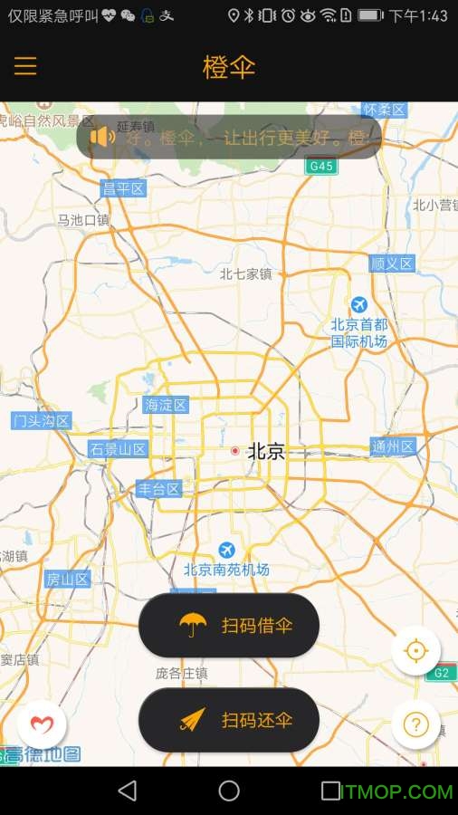 界面清爽,一目了然。采用扁平化设计风格,重点突出伞具位置信息,让用户能够快速找到最近的借伞点,操作流程简单直观。