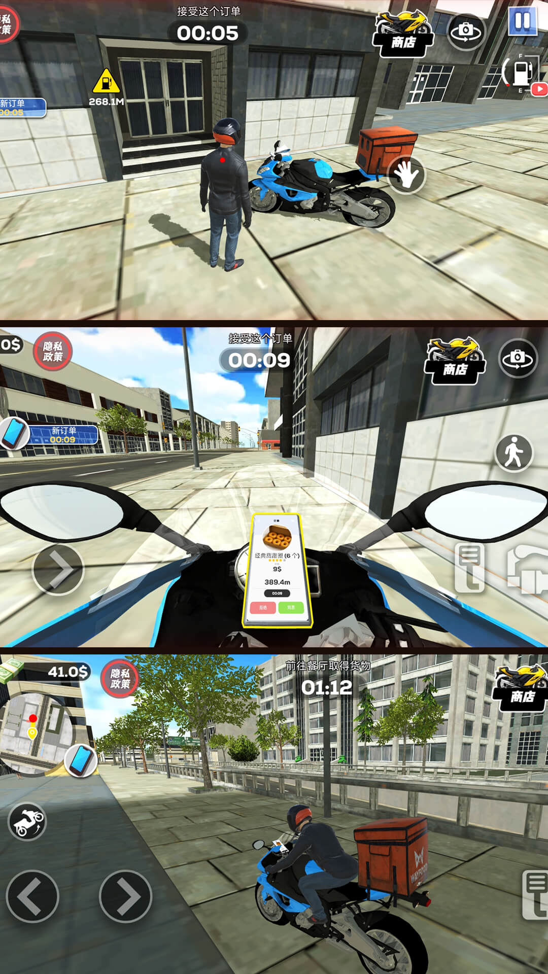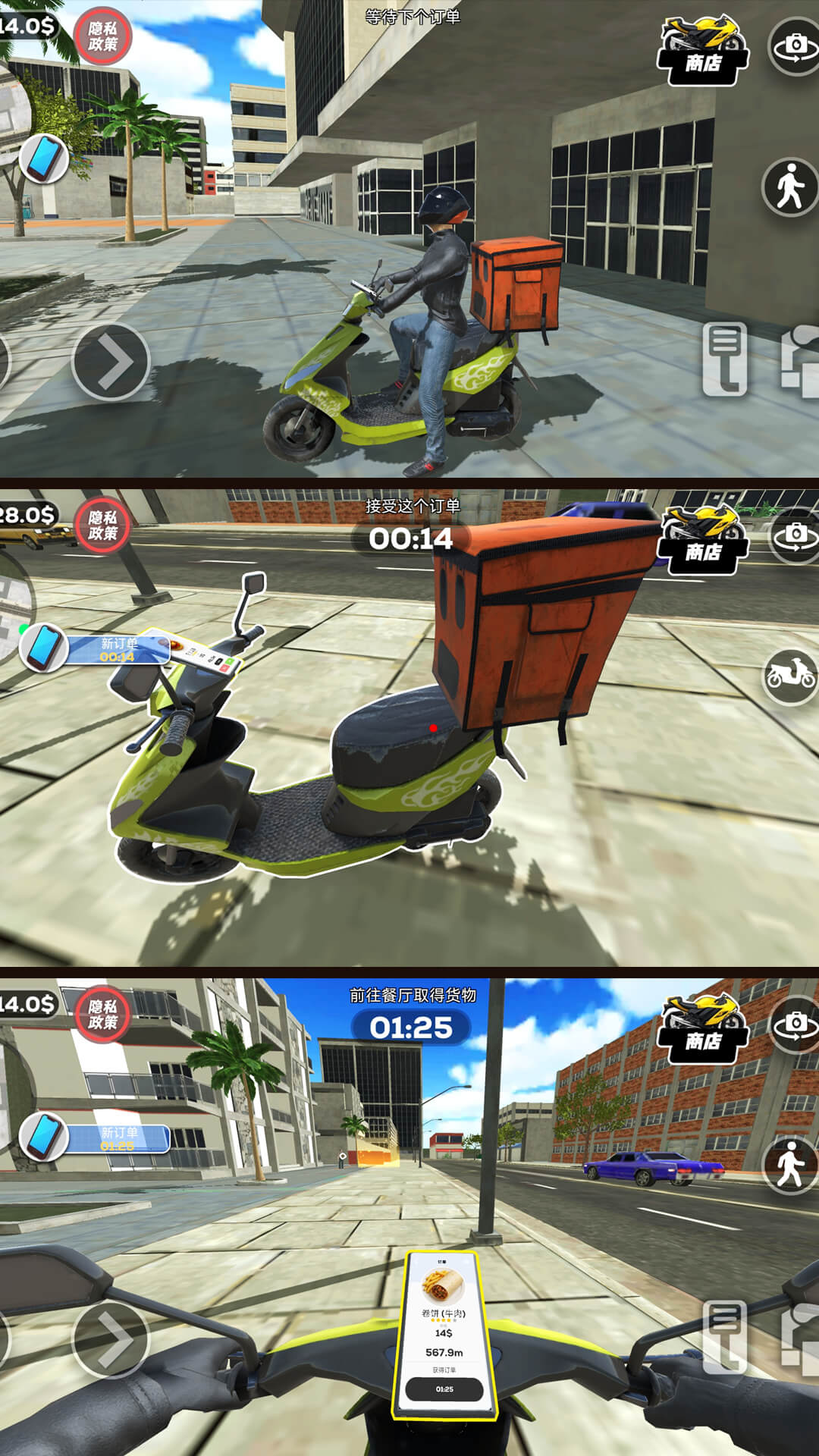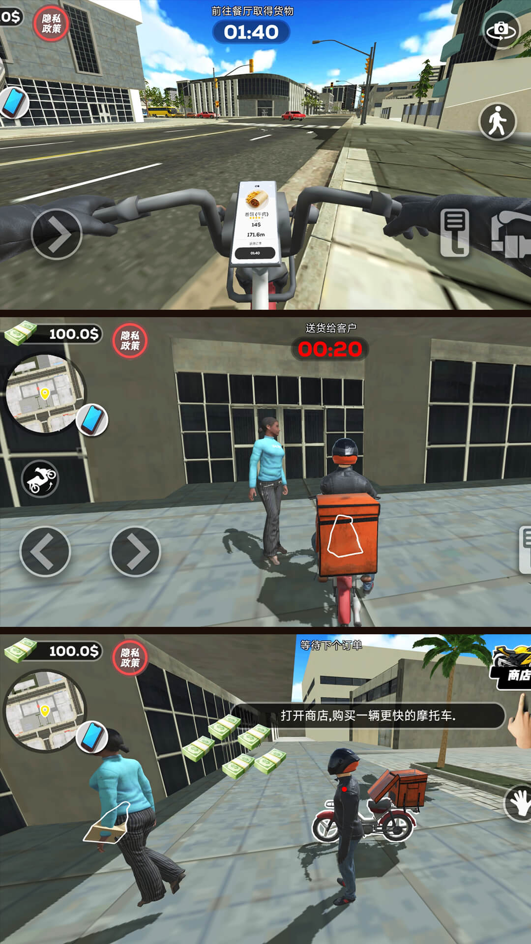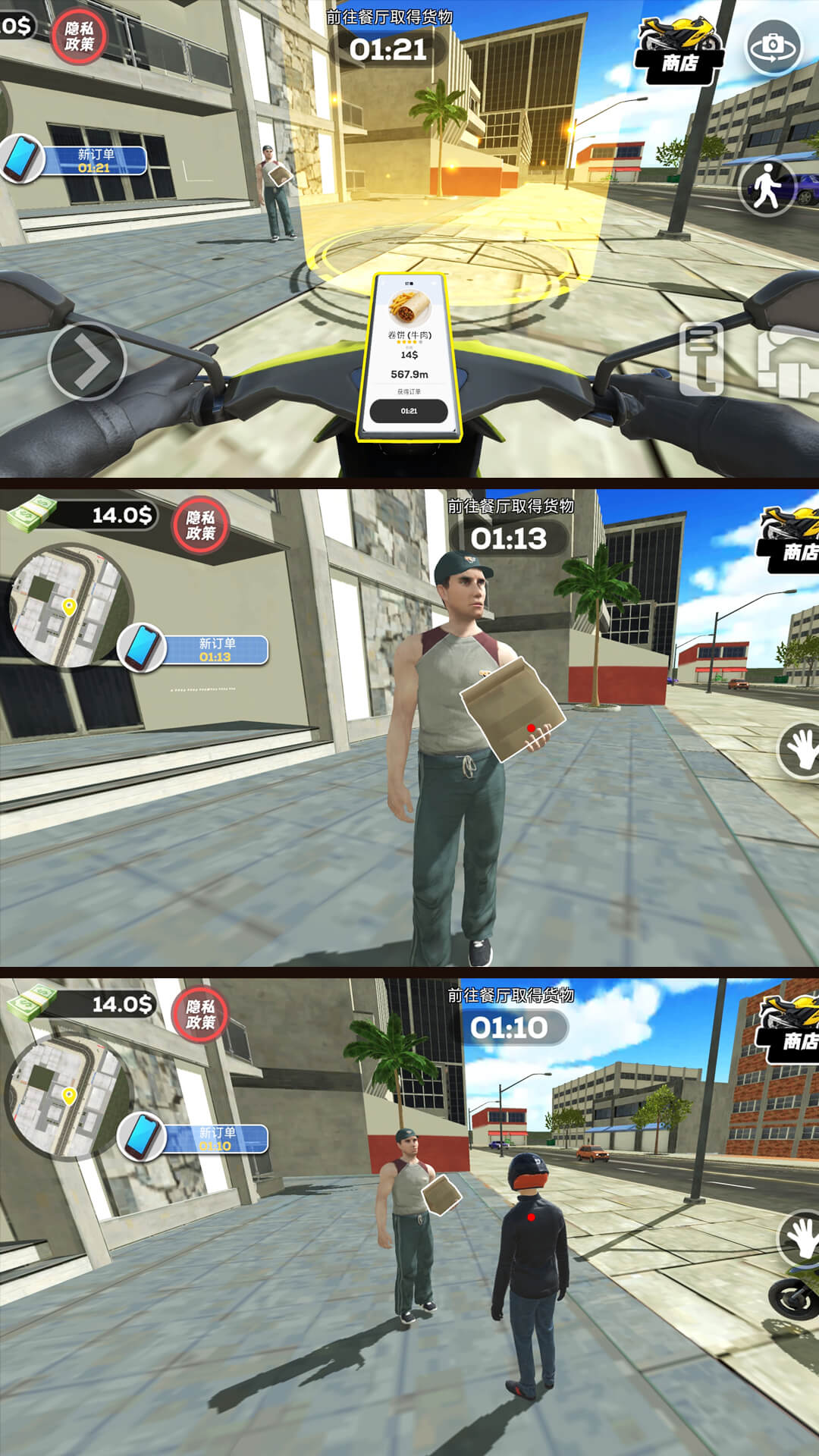 游戏的核心玩法围绕配送任务展开,玩家可以自由选择接单,每单任务都有不同的时间限制和配送难度。随着游戏进程的推进,玩家可以解锁更多区域、升级配送工具,甚至雇佣其他骑手组建自己的配送团队。游戏还加入了丰富的剧情元素,玩家在配送过程中会遇到各种有趣的角色和事件,这些互动不仅能增加游戏的趣味性,还会影响玩家的声誉和收入。