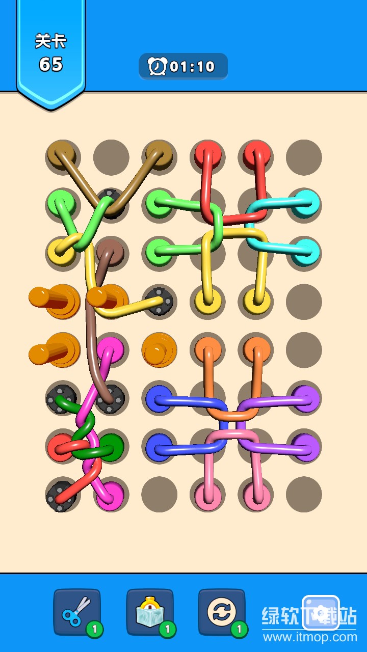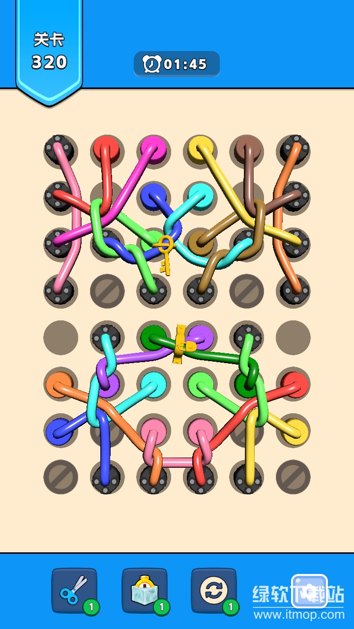 玩法创新性:突破传统消除类游戏框架,将绳索物理模拟与解谜深度结合。比如第47关需要利用弹性绳索的反弹特性弹射钥匙,这种动态解法远超静态三消游戏的策略维度;