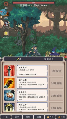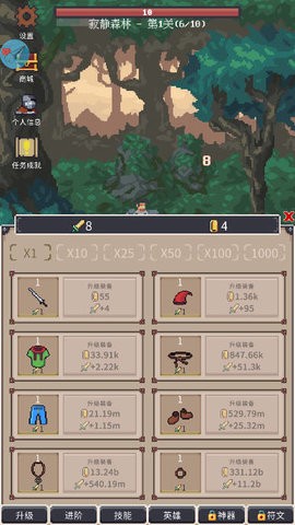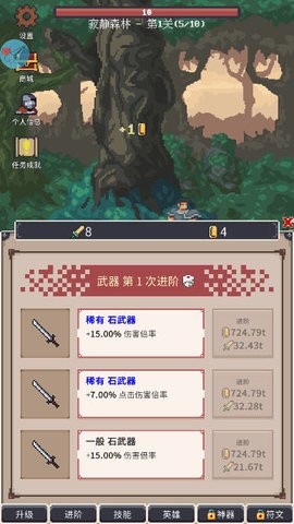 这是一款典型的点击放置类挂机游戏,核心玩法循环包括:升级装备、进阶强化、击败敌人、获取金币、招募英雄、召唤神器以及鉴定符文石等。通过这些方式不断提升实力,挑战更强大的敌人。