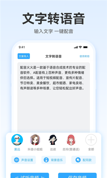 配音火火app是一款功能强大的专业配音软件,它重新定义了数字语音的边界。我们精心打造的声音库包含超过200种不同风格的声音类型,涵盖男声、女声、童声等多种音色,每种音色还提供8种以上的情绪变化选择。这些声音可以完美适配各类应用场景,包括但不限于短视频创作、商业广告、教育培训、游戏配音、有声读物等多元化需求。我们的智能配音系统支持30多种语言和方言,让您的作品能够触达更广泛的受众群体。