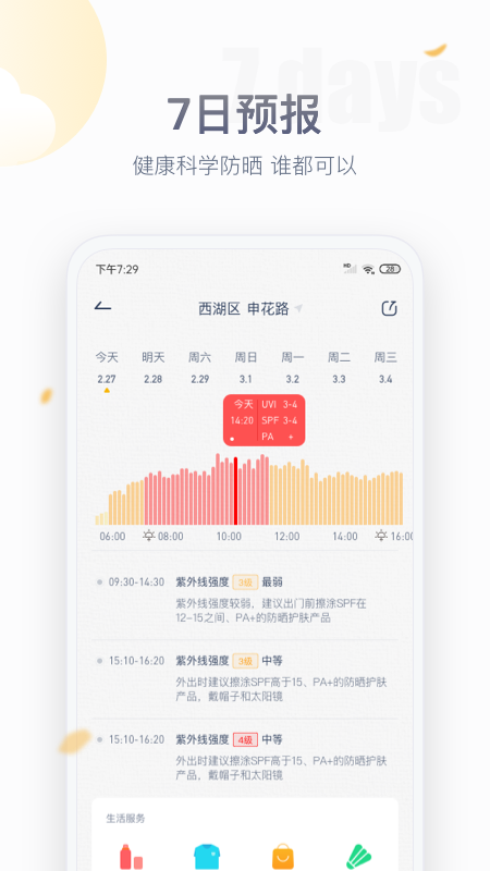 安心防晒APP是一款专为户外生活设计的智能防晒助手,通过精准的紫外线监测和个性化防护建议,让防晒变得更简单高效。它能实时追踪您所在位置的紫外线强度、空气质量指数及未来天气趋势,并结合科学数据提供穿衣搭配、护肤建议等生活指南。无论是日常通勤、旅行度假还是户外运动,只需一键查询,即可获取定制化的防晒方案,告别晒伤烦恼。更有15天超长天气预报和7日紫外线预测功能,助您提前规划完美行程,尽享阳光无忧生活。