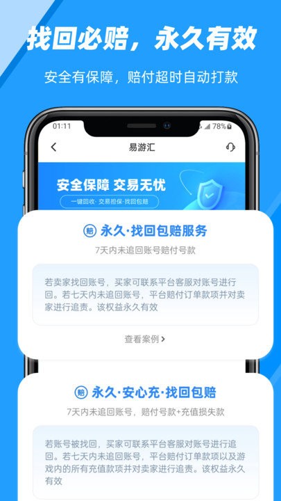 保障服务齐全:易游汇提供多种保障服务,让用户交易过程无后顾之忧。包括7天无理由退款、账号找回保险等,全方位保障用户权益。