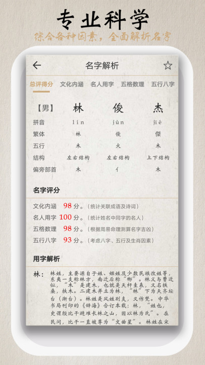 起名测名取名是由专业团队精心打造的一款多功能起名测名工具。开发团队深入研究汉字文化,从字音、字形、字义等多个维度进行考究,同时结合五行八字、三才五格、周易八卦等传统易学理论,并运用现代大数据技术分析名字的流行趋势。APP收录了海量古今名人用字及经典著作中的名字,为用户提供科学、全面的起名、测名、取名服务。无论是个人取名还是商业命名,起名测名取名都能为您提供专业建议,助您找到一个既有文化底蕴又符合现代审美的完美名字。