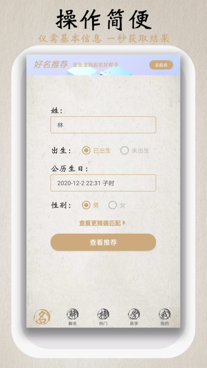 起名测名取名APP拥有超过30万个经过精心筛选的名字库,这些名字不仅常用、寓意美好,还蕴含着丰富的文化内涵。用户只需输入姓氏、性别以及出生日期和时间等基本信息,系统就会自动生成一系列适合的名字推荐。每个推荐名字都会附带详细的解析信息,包括五行属性、读音标注、文化内涵解释以及综合评分等,帮助您全面了解每个名字的特质,做出最佳选择。