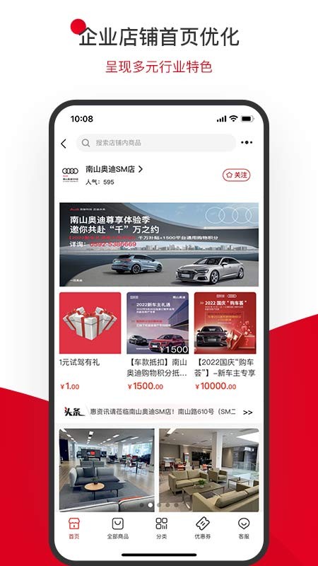 预约试驾,汽车市场,软件上构建了完善的汽车渠道模式和市场内容,用户可以自由的挑选和查看各种不同类型的汽车,还可以进行试驾服务。平台与多家4S店合作,提供新车展示、二手车交易等全方位汽车服务,让用户轻松实现购车梦想。