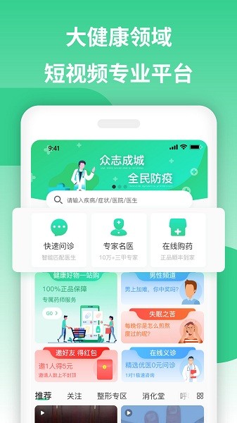 大健康领域短视频专业,新增视频分类标签系统,便于用户快速找到感兴趣的内容。好医生在线健康科普,邀请更多权威专家入驻平台。好看的医生护士视频都在这,优化了视频播放体验,支持高清画质选择。