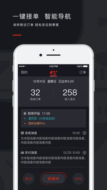 2、多样订单,一键稳赚:支持实时派单和预约订单,满足不同时段的工作需求。无论是短途即时单还是长途预约单,都能一键接单,规划您的长期收益。