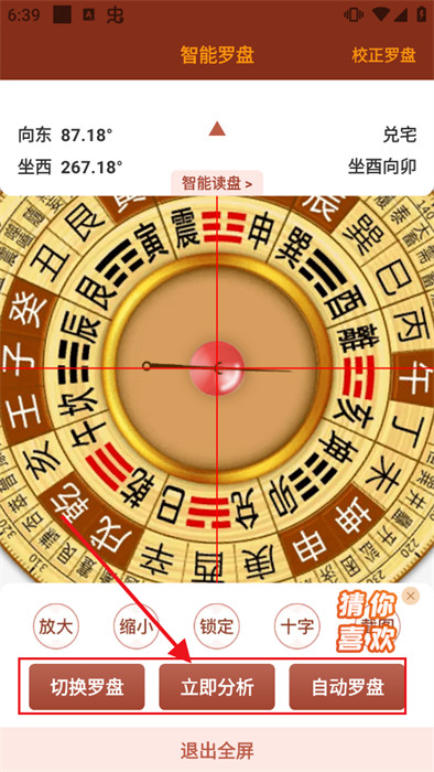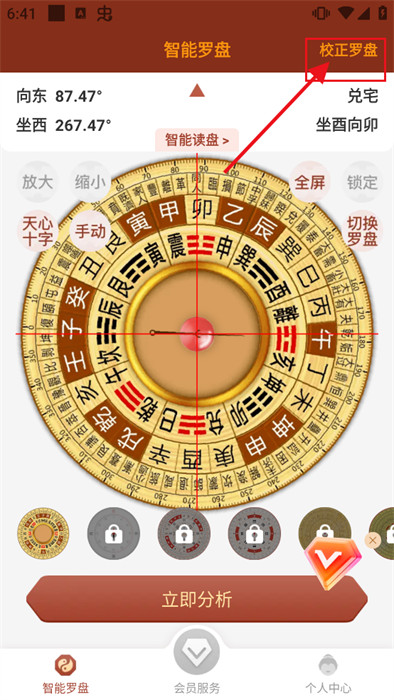 打开应用后,首页会显示一个大型数字罗盘界面,用户可点击底部"分析"按钮获取详细风水解读。通过"切换背景"功能可以个性化罗盘外观样式,满足不同审美需求。如需调整罗盘参数,返回首页点击"矫正罗盘"即可恢复默认设置。应用还提供实景拍摄功能,通过摄像头捕捉环境画面进行即时风水分析,让传统风水工具与现代科技完美融合。
