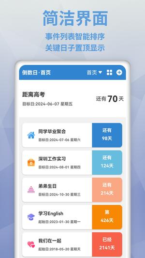 倒数日mydays不仅是一款工具软件,更是您生活中的贴心助手。它帮助您珍藏美好回忆,规划未来生活,让每一天都过得更有意义。现在就下载体验,开启您的时间管理新方式!