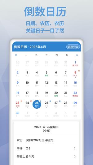 倒数日mydays安卓版本具备更多实用功能,满足您的多样化需求。软件提供"历史上的今天"查询功能,让您了解每一天的特殊意义。您可以自定义事件背景,并添加桌面挂件,方便随时查看。重要日期支持醒目置顶显示,并可按时间远近排序,让时间管理更加清晰。特别值得一提的是,软件支持从1901年至2049年的农历日期转换,方便传统节日记录。软件内置纪念日、工作、生活三大默认分类,同时支持创建更多自定义分类,完美适应各种记录场景。