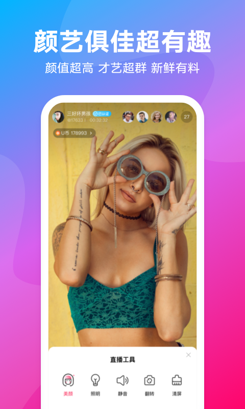 颜值超高,才艺超群,新鲜有料,内置多种美颜滤镜和特效道具,让直播更有趣;
