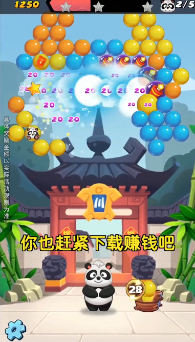 泡泡龙熊猫传奇红包版是一款集休闲娱乐与红包奖励于一体的创新游戏。它将传统的泡泡龙玩法进行了现代化改良,加入了熊猫元素和红包机制,让经典游戏焕发出新的活力。想象一下,当你将熊猫头顶上的所有泡泡都精准消除,看着它们一个个消失并获得红包奖励时,那种成就感简直无与伦比!这款游戏不仅能够打发时间、放松心情,还能带来实实在在的收益。如果你也想体验这种独特的游戏乐趣,现在就赶快下载泡泡龙熊猫传奇红包版开始你的冒险吧!