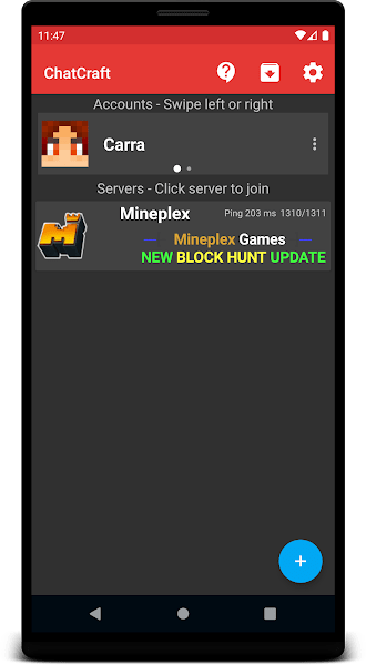 最新版本的chatcraft带来了更多令人兴奋的功能:完美支持1.7.2至1.17版本的所有服务器连接;全面兼容游戏内的彩色聊天系统;登录后自动传送至出生点;新增小地图和重力系统;特别优化了对Forge服务器的支持;玩家列表现在可以显示个性化皮肤;创新的移动控制功能让操作更加便捷;通过点击物品栏中的物品即可实现全服传送;完整的聊天记录功能让您随时回顾游戏对话;优化的AFK体验包括自动重连、重复移动/消息/命令等功能;可自定义的通知系统会在受到攻击或收到特定消息时提醒您;多账号支持让您可以用不同身份登录不同服务器;自动登录和注册功能可以记住非高级服务器的密码;消息历史记录和Tab补全功能让聊天更加高效。
