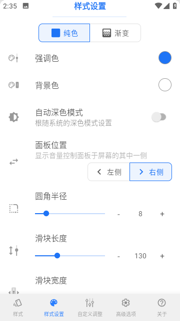 点击最下方的样式设置,可以设置样式的背景颜色、模式、面板位置、半径、长度、宽度等等,大家可以自己探索一下。这些详细的设置选项让用户可以微调每一个细节,打造完美的音量面板。