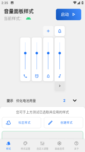 安装完成打开后,选择最下面的样式设置,可以看到各式各样系统的音量调整画面。这里汇集了主流手机系统的音量面板风格,用户可以根据个人喜好自由选择。